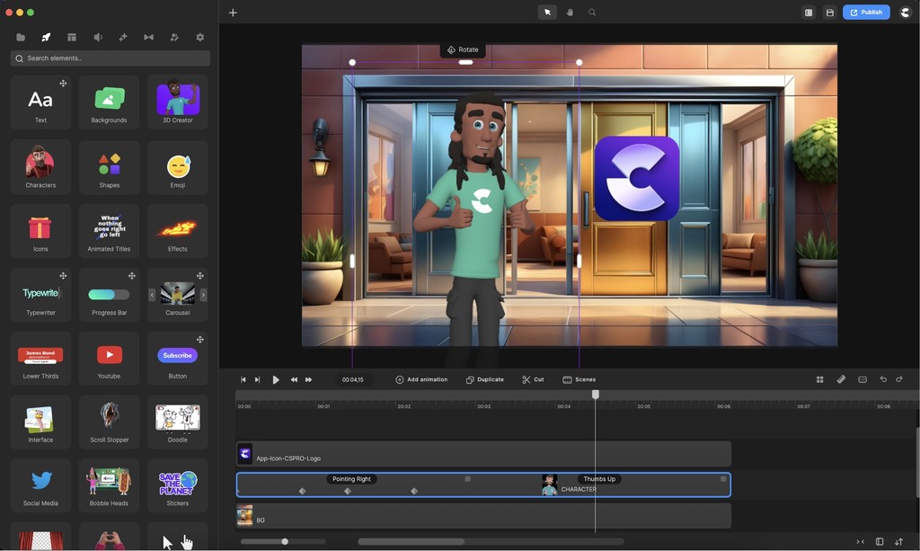 Build entire explainer videos with gorgeous 2D & 3D characters, backgrounds & icons! Changing actions is as easy as point & click, no complex rigging required.